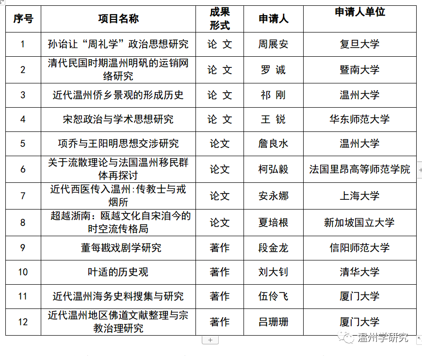 执委会积极发动世界温州人联谊总会社科分会的资源网络,通过专家学者推荐和自荐,陆续收到来自国内外高校青年学者的申请。截至11月30日共收到申请书42份。12月上旬,经过多方专家评审、网络公示等环节后,最终确定以下12个项目作为第一批资助项目。这只是温州社科研究机制创新的“一小步”,却是温州发动社会力量支持温州学研究的“一大步”。